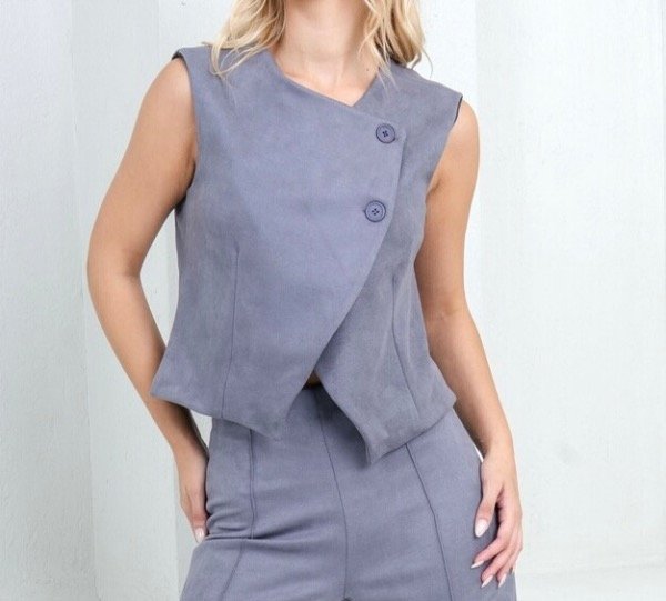 Chaleco de scuba con acabado gamuzado. Esta integramente forrado con poplin o lienzo y lleva un corte asimetrico con dos botones externos y uno interno de calce.
