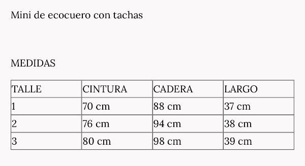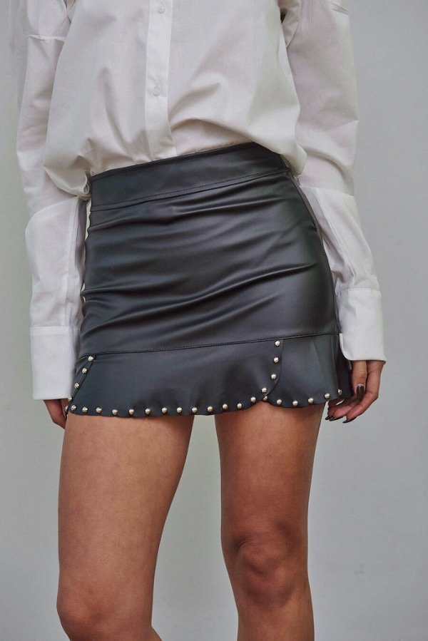Mini de cuero con cierre, terminacion en volados y detalle de tachas.